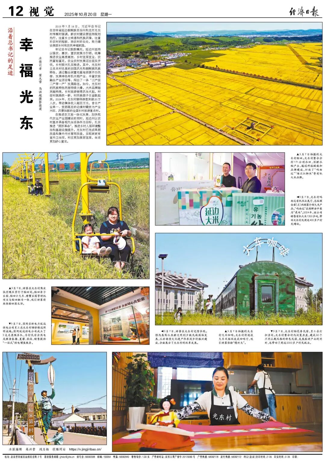 牢记总书记殷殷嘱托,延边州坚持以强农、惠农、富农政策为引领,统筹推进农业高质高效、乡村宜居宜业、农民富裕富足,农业农村发展迈出坚实步伐,乡村振兴扎实推进。其中,光东村立足本村优美的田园风光和朝鲜族民族特色,通过整合闲置宅基地资源开办民宿、发展绿色有机水稻产业、丰富农旅融合产业项目等,闯出了一条“三产促二产带一产”发展路径。如今,光东村的民族特色民宿持续火爆,大米品牌越来越响亮,乡村旅游做得风生水起,村容村貌焕然一新,村民钱袋子日益鼓起来。2024年,光东村接待游客突破20万人次,带动集体收入超百万元,昔日产业单一、贫困落后的边境村蝶变为产业兴旺、风景如画的全国乡村旅游重点村。