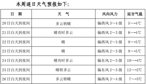 预计全州平均气温为2.0℃左右,比常年同期低3.5℃左右。21日开始气温缓慢回升,25日白天最高气温一般为10℃~13℃,26日气温下降。预计全州无明显降水,比常年同期明显偏少。