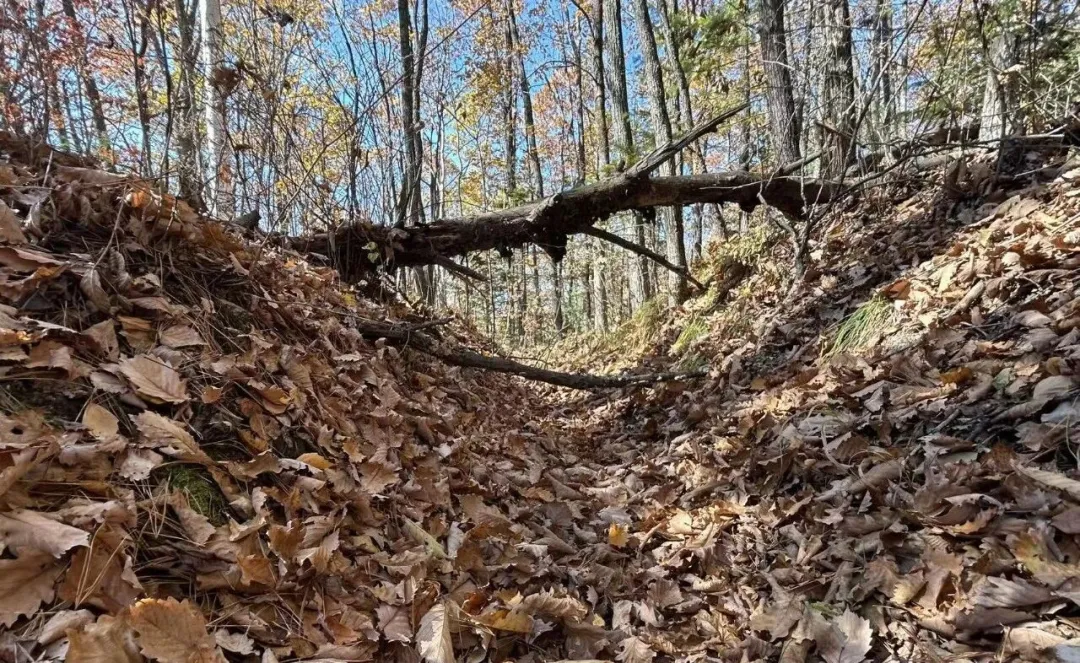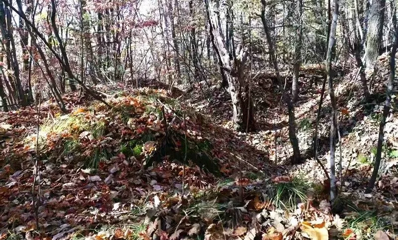 10月22日,安图县委党史研究室与县老促会组成踏查组,于小营子岭一带发现一处保存较为完整的抗战时期遗址。深秋叶落之际,正是野外踏查的良好时机。踏查组在万宝镇与永庆乡交界处的密林中,搜寻并确认了小营子岭伏击战的相关遗迹。