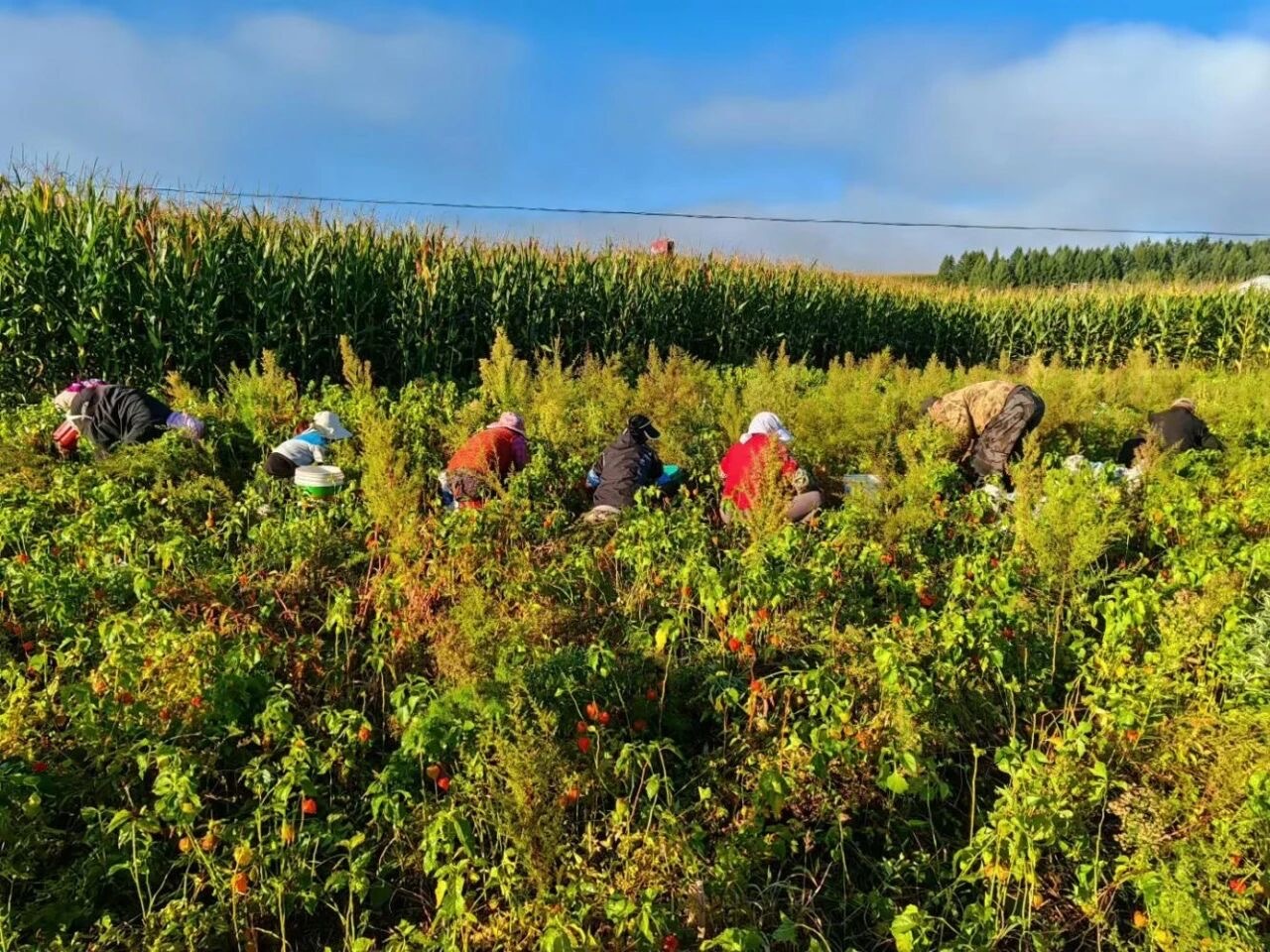 秋风送爽,硕果盈枝。走进安图县松江镇文昌村的农田,橙红饱满的菇娘果缀满枝头,在翠绿叶子的映衬下分外夺目,农户们穿梭其间忙碌采摘,勾勒出一幅动人的丰收画卷。