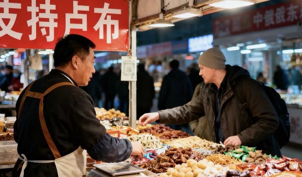 俄语路牌与“卢布结算”标识并肩而立,“退税商店”里境外游客忙着挑选特产,珲春口岸的通关队伍中,每张笑脸都透着对消费体验的期待。