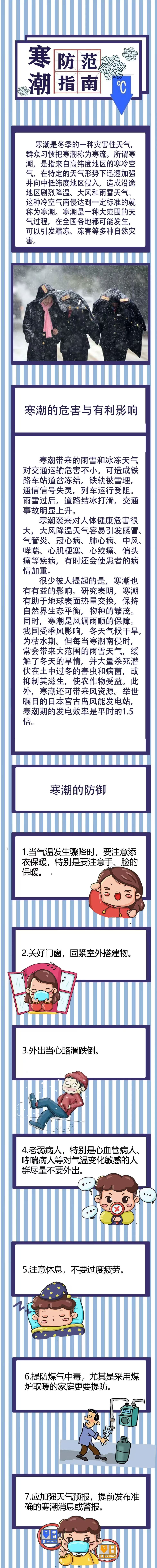 2.广大城乡居民及时增添衣物,注意防寒保暖,预防感冒等呼吸道疾病的发生及心脑血管疾病的复发和加重;