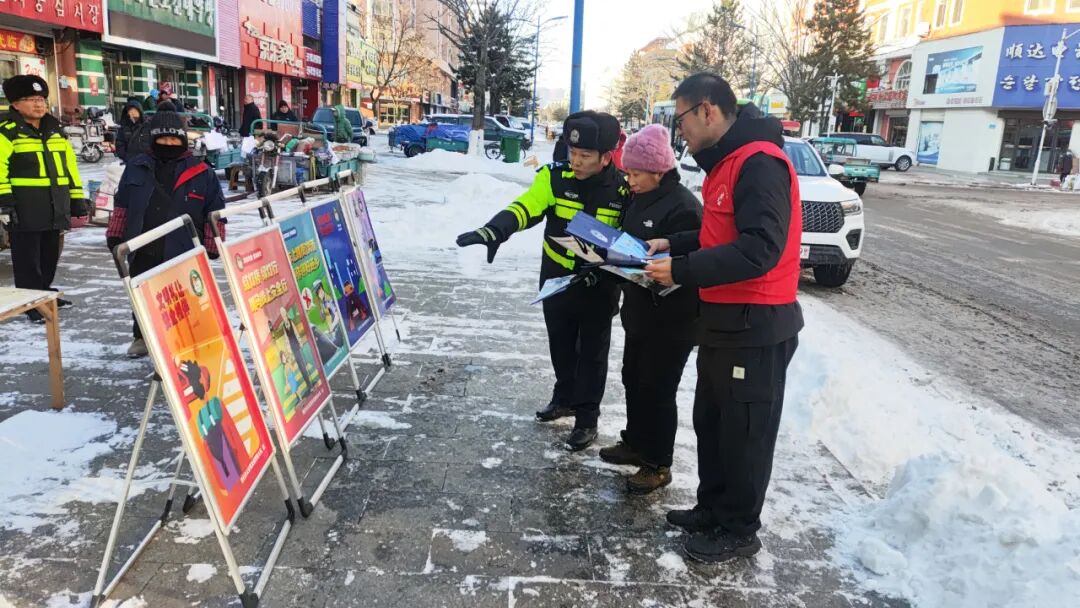 安图县公安局交通管理大队以“文明交通 礼行天下”为主题,创新宣传形式,在延百门前、经贸大厦十字路口、公交总站及客运站等人员密集区域,开展了一场别开生面的交通安全“快闪”宣传活动,让交通安全知识“零距离”触达群众。活动当天,交警宣传员们提前布局各重点点位,借助商圈购物人流、餐饮消费客流、公交客运候车客流集中的优势,迅速搭建起临时宣传阵地。在延百门前,宣传员们向过往市民发放交通安全宣传手册,结合冬季出行特点,重点讲解行人过街“一停二看三通过”、机动车礼让斑马线等核心知识;经贸大厦蜜雪冰城前,针对年轻消费群体较多的特点,用通俗易懂的语言普及骑乘电动车佩戴安全头盔、拒绝酒驾醉驾等安全常识,现场互动问答氛围热烈;公交总站和客运站点内,宣传员们客运司机及乘务人员重点宣传安全带使用、不超员超载、拒绝疲劳驾驶等关键内容,结合典型事故案例剖析交通违法的严重危害,引导大家自觉遵守交通规则。此次“快闪”宣传活动打破了传统宣传模式的时空限制,以灵活、高效、接地气的方式,将交通安全知识融入群众日常生活场景,让大家在休闲购物、等候乘车的碎片化时间里轻松学习实用交通知识。