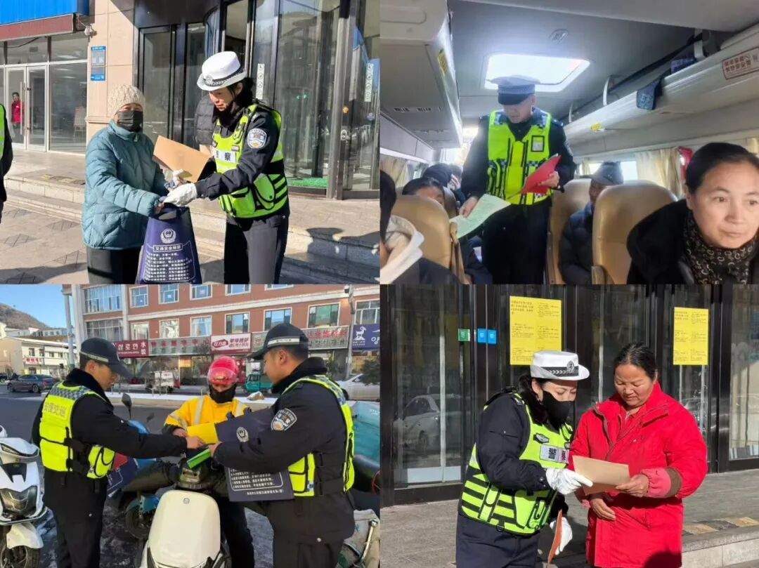 12月2日,珲春市公安局交通管理大队联合珲春森林公安分局交通管理大队、珲春市交通运输综合行政执法大队在珲春市客运站候车大厅开展“122全国交通安全日”宣传活动。活动中,民辅警通过多样化的宣传形式,设立咨询台、摆放宣传展板、发放宣传材料、讲解交通事故案例,耐心为现场旅客、群众解答道路交通安全知识;向客车、出租车司机讲解冬季道路交通注意事项,严禁酒驾醉驾、“三超一疲劳”等交通违法行为,并对出站车辆进行安全检查,提醒司机切勿“病车上路”。随后,民辅警走进广场、综合市场等人流密集区域,通过发放宣传彩页、宣传手提袋等形式,向群众讲解冬季道路交通安全知识及各种交通违法行为的严重危害性,劝导群众在日常生活中要遵守交通规则,杜绝闯红灯、逆行、横穿马路等不文明交通行为,寓教于乐地普及交通法规,引导大家共同践行“文明交通 礼行天下”。