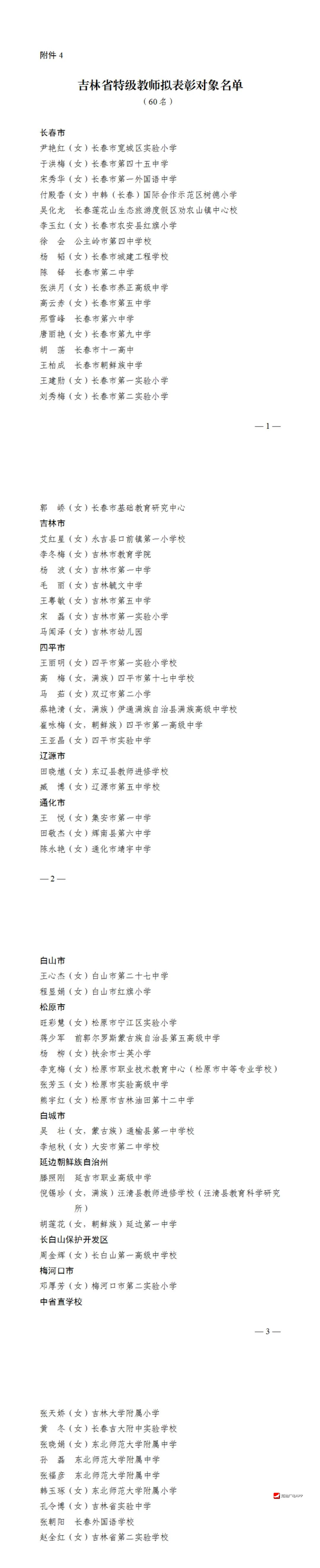 根据吉林省人力资源和社会保障厅、吉林省教育厅《关于组织开展吉林省教育系统先进集体、先进工作者和优秀教师评选表彰工作的通知》(吉人社联〔2025〕65号)要求,按照表彰工作安排,经组织推荐、联审上报、综合评审、实地考核,并报吉林省教育系统先进集体、先进工作者和优秀教师评选表彰工作领导小组同意,拟表彰吉林省教育系统先进集体99个、吉林省教育系统先进工作者50名、吉林省优秀教师240名、吉林省特级教师60名(拟表彰对象名单附后),现予以公示,广泛听取意见,接受社会和群众监督。