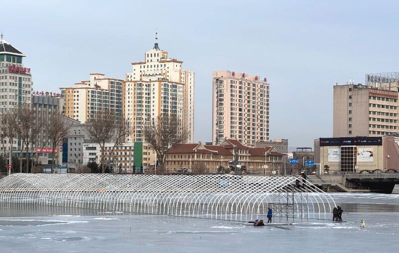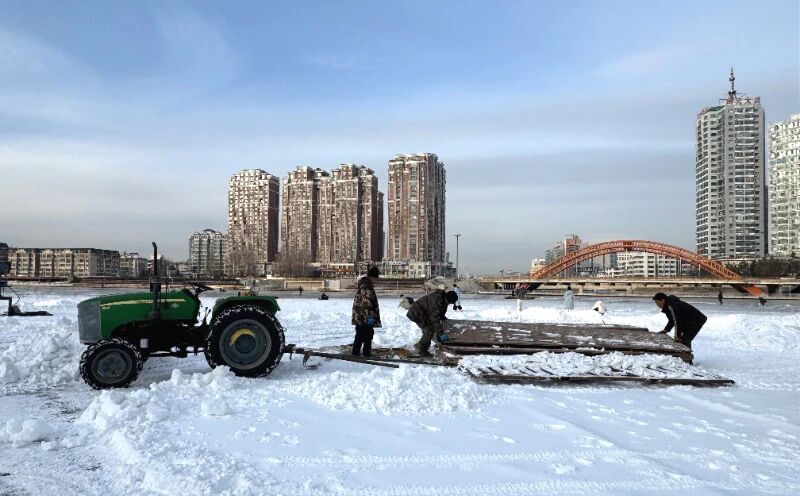 12月15日,记者在延吉市布尔哈通河延吉大桥西侧的冰面上看到,工人们正在紧张有序地造雪,这也标志着2025—2026新雪季延吉冰雪欢乐谷的筹建工作启动。