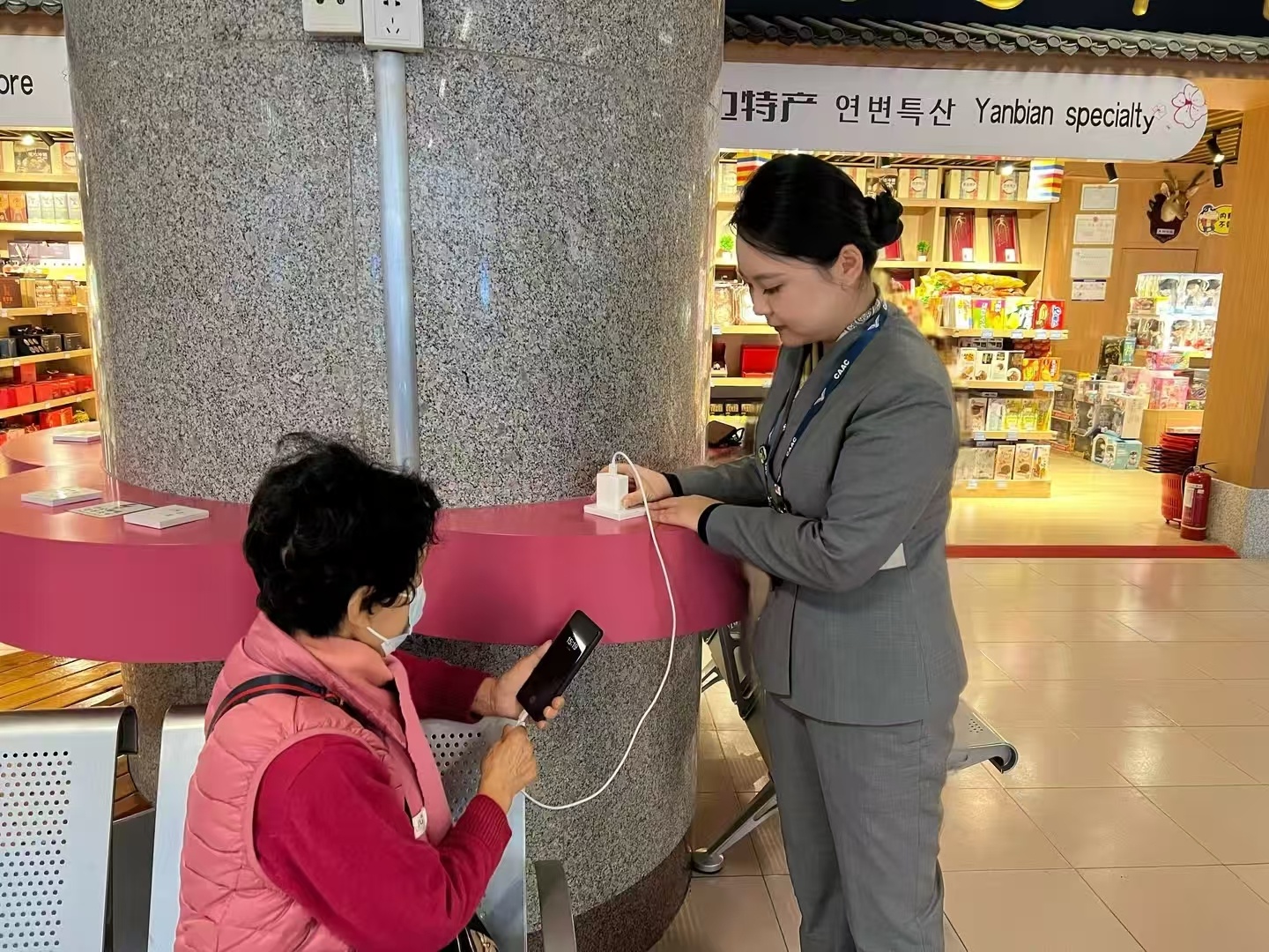 在候机楼内,“银翼”服务专员还将主动识别银发旅客,全程引导协助优先值机、安检、候机直至登机,同时贴心提供老花镜、放大镜等便民工具。候机区配备体温计、纸巾、热饮及充电设备。“银翼”服务专员定时巡视,及时回应老年旅客需求。登机时,“银翼”服务专员将协助老年旅客优先登机、安置随身行李,并与机组做好交接,确保其行程顺畅。