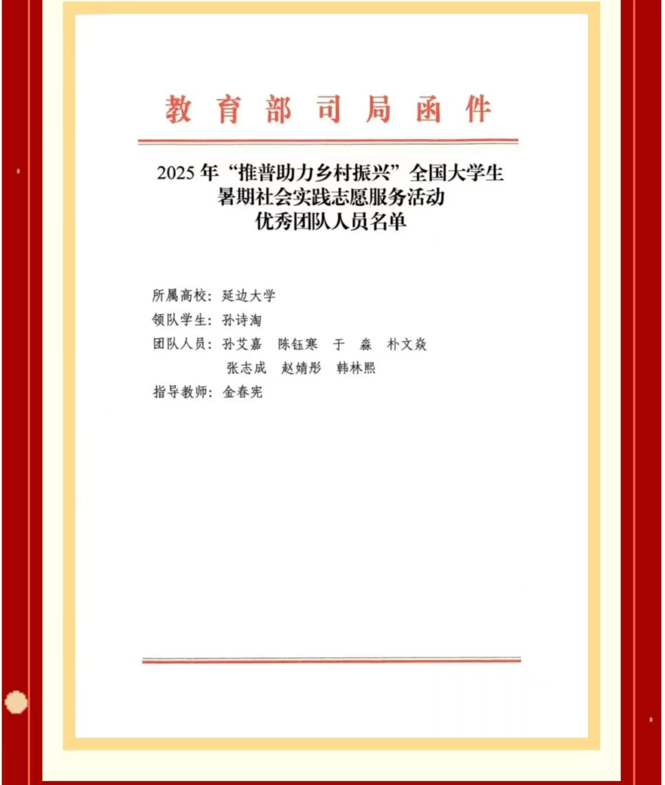 近日,由教育部语言文字应用管理司、共青团中央青年发展部联合开展的2025年全国大学生“推普助力乡村振兴”暑期社会实践志愿服务活动评选结果正式公布。延边大学外国语学院“乡音筑梦”推普实践队与文学院“语海先锋”推普团双双斩获“优秀团队”荣誉称号。充分彰显了延大学子扎根基层一线、主动服务社会、助力乡村振兴的青春责任感与使命担当。
