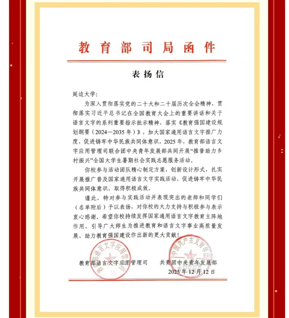 此外,教育部语言文字应用管理司与共青团中央青年发展部特联合向延边大学发来表扬信,对学校在本次“推普助力乡村振兴”志愿服务活动中展现的高度组织力、突出实践成效及积极社会影响给予充分肯定与高度赞扬。