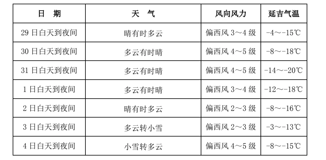 延边州气象局预计预计本周(2025年12月29日-2026年1月4日)总的天气趋势是气温略低,降水偏少。预计全州平均气温为-13.0℃左右,比常年同期低0.3℃左右。12月29日开始气温逐渐下降,1月2日-3日气温回升,4日再次下降。全州平均降水量不足1毫米,比常年同期偏少。预计1月3日夜间至4日白天有小雪。