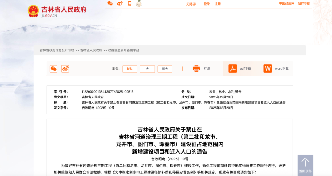 二、自本通告发布之日起,未经省政府批准,在吉林省河道治理三期工程(第二批和龙市、龙井市、图们市、珲春市)建设征占地范围内,禁止任何单位和个人新建、扩建和改建项目,禁止擅自开发土地、修建房屋及新建其他设施,禁止新栽多年生经济作物和林木。相关部门要立即停止办理该区域内项目及资源开发的有关证照。