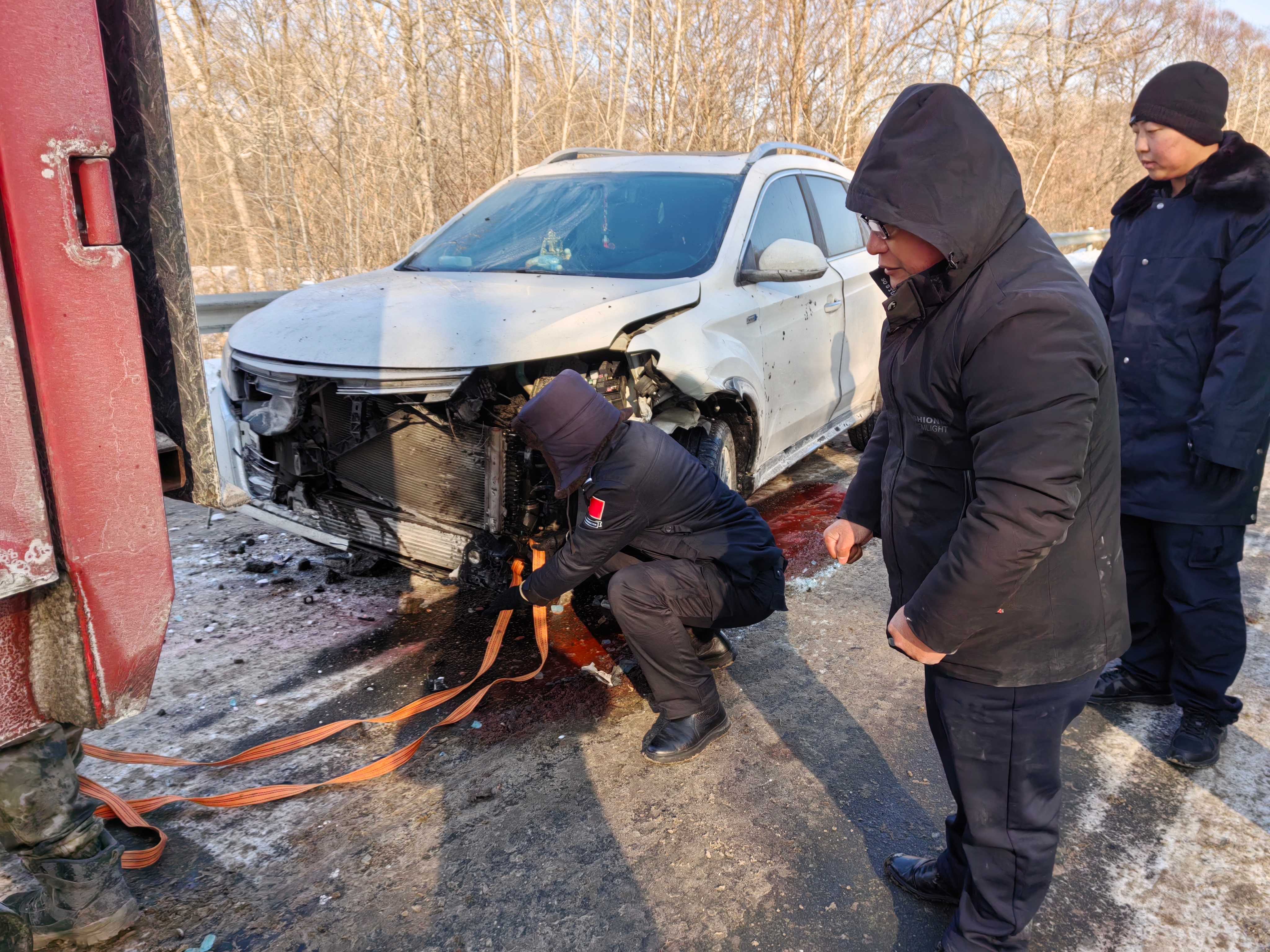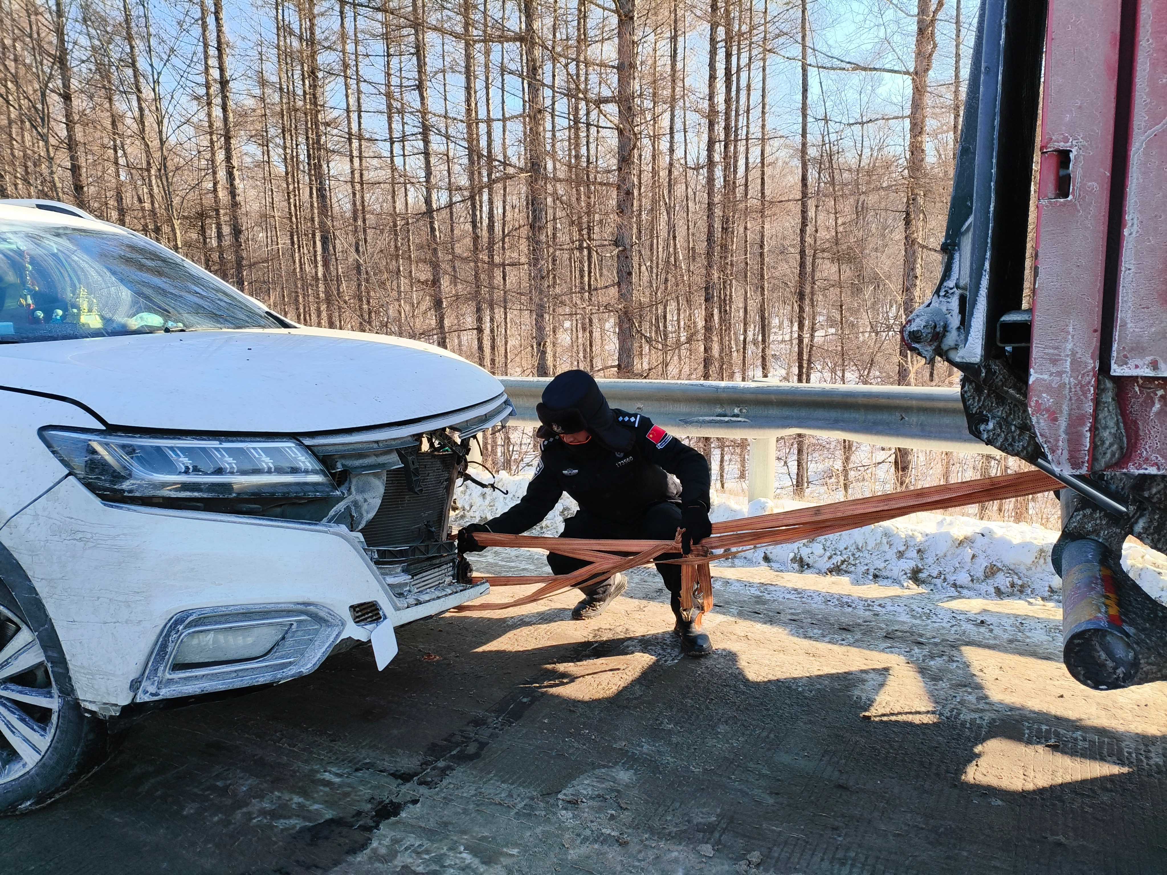 由于事故现场在桥上,路面较窄且前后方均有结冰,必须马上把车辆移开。民警和车主首先尝试用人力将车辆推至路边安全地带,然而,事故导致车辆制动系统抱死,车轮无法转动。看到这种情况,民警当机立断,调整救援措施,寻找可协助救援的大型车辆将事故车辆拖到安全地带。