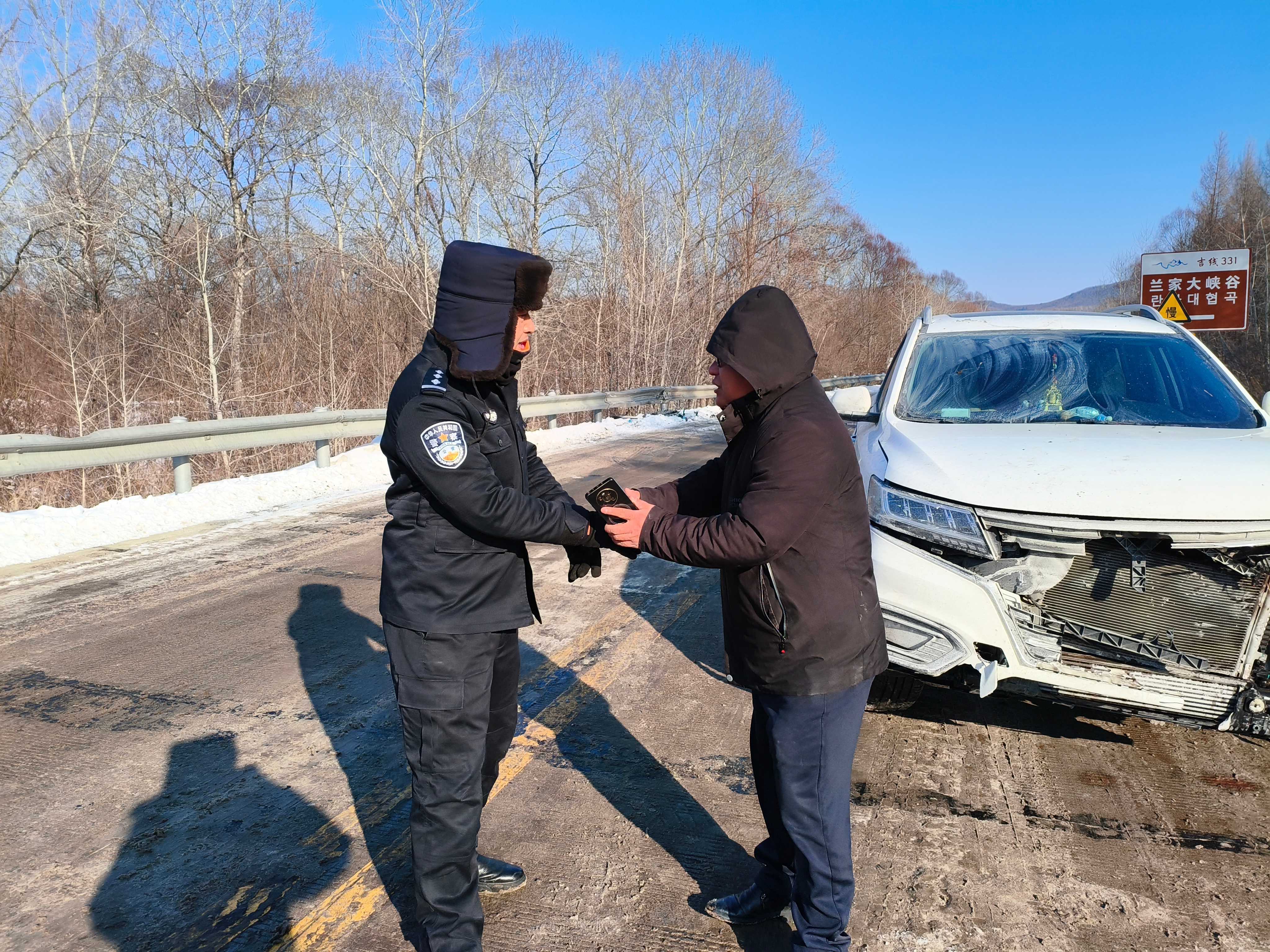12月26日11时55分,珲春边境管理大队桦树公安检查站民警接到求助电话:位于G331春化段兰家村村口100米处,一辆苏牌SUV横在大桥中间,过往车辆如不及时刹车躲避极易造成连环交通事故。了解情况后,民警带齐救援工具火速赶往救援现场。