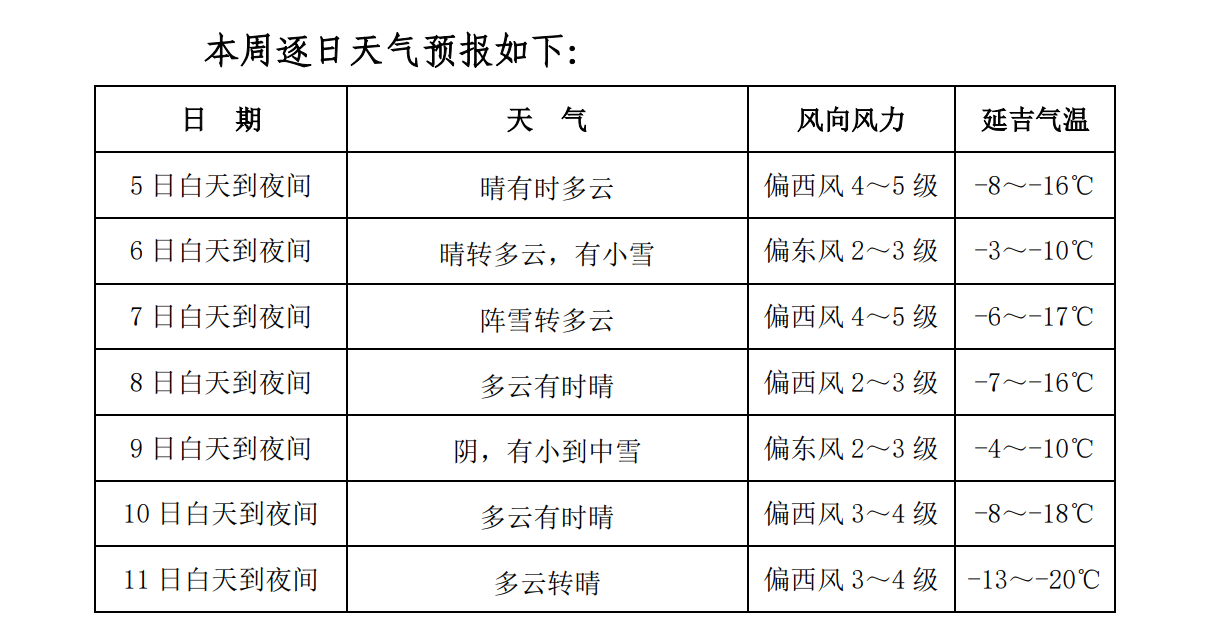预计全州平均气温为-12.0℃左右,比常年同期高1.3℃左右。本周气温多波动,6日气温回升,7日下降,9日短暂回升,10日开始气温明显下降。全州平均降水量为2毫米~4毫米,比常年同期多1毫米左右。预计6日夜间到7日上午有小雪、9日有小到中雪。