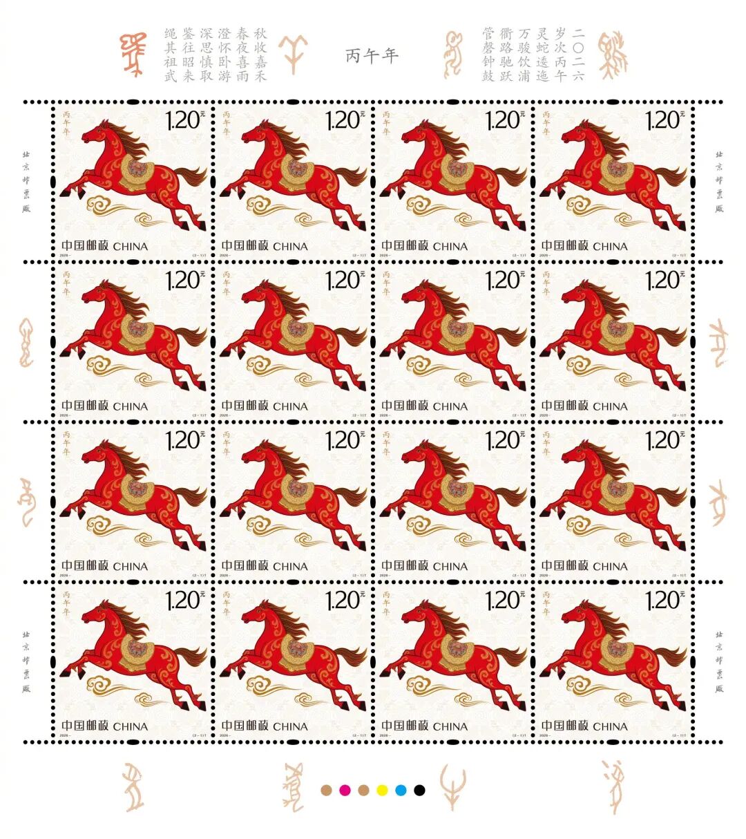 2026年1月5日,2026年《丙午年》特种邮票正式首发。《丙午年》特种邮票全套共两枚,第一枚邮票图案名为“驰跃宏图”,图中红马踏云、鬃毛如焰。第二枚邮票图案名为“万骏臻福”,图中三骏并驰、祥纹环绕。该邮票由王红卫、赵恩重设计,全套邮票面值2.40元,计划发行套票2668万套,版式二162万版,小本票280万本。