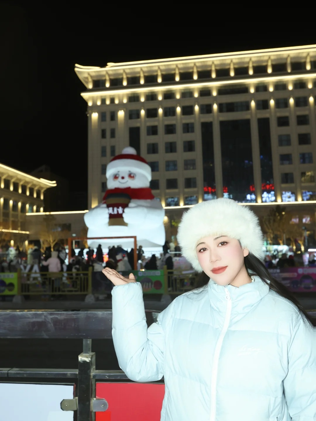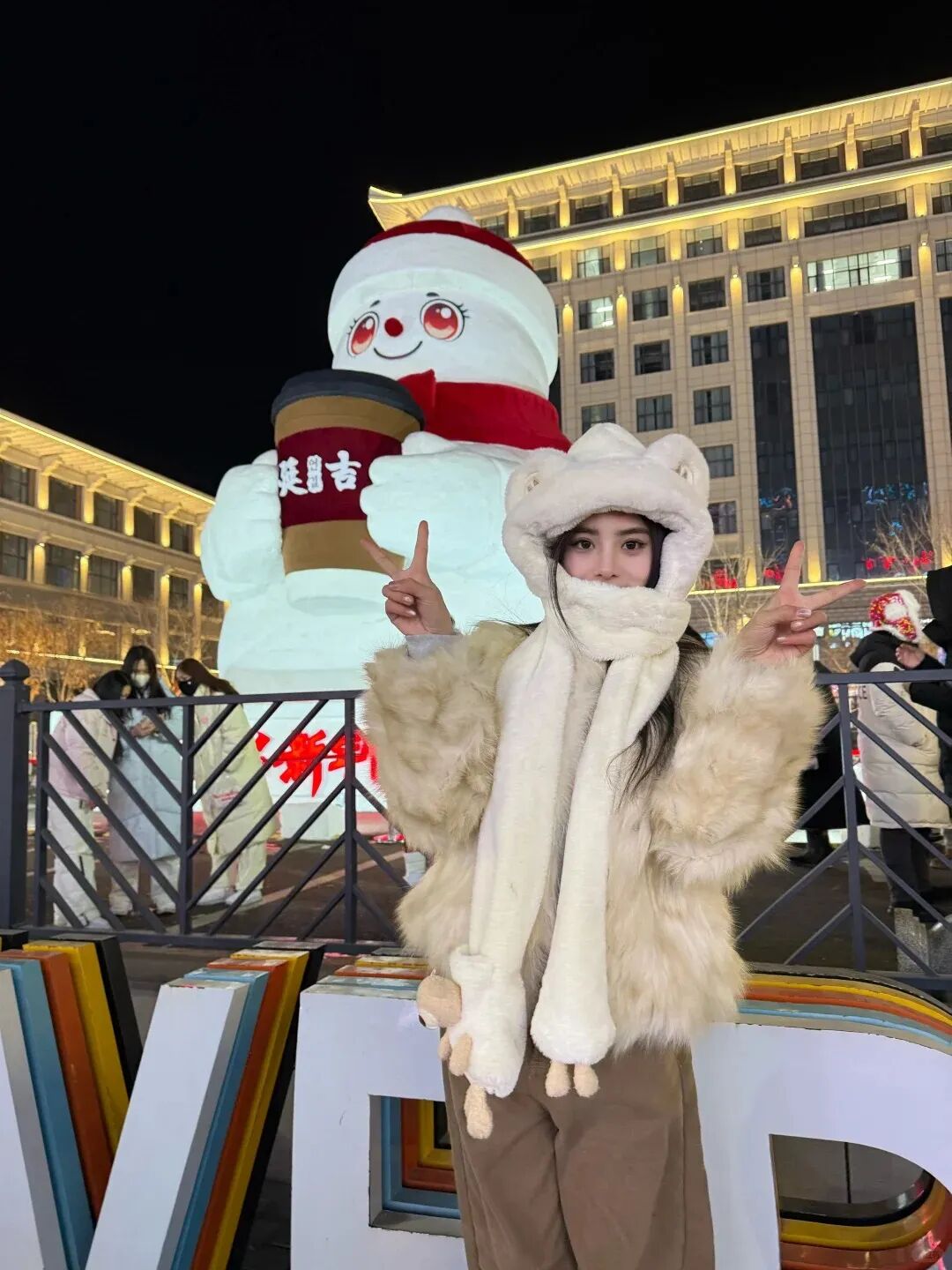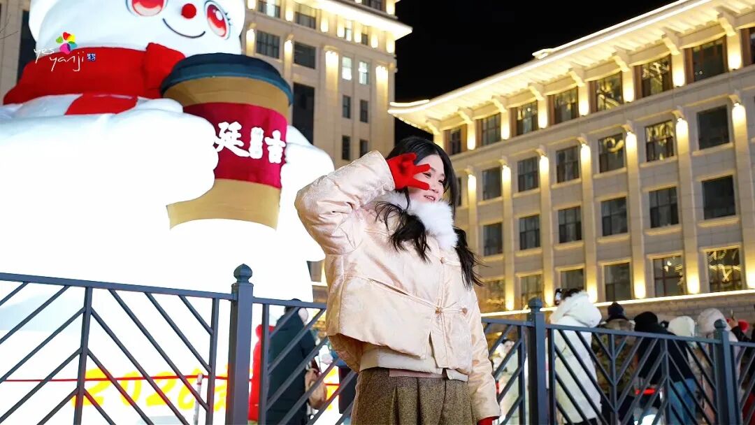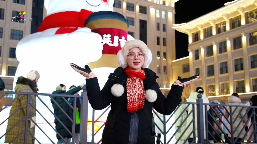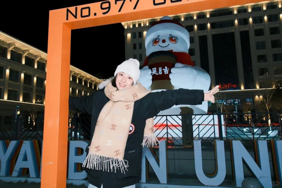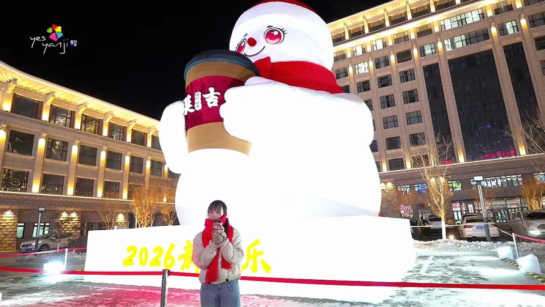 马路远景(全景氛围感):在对面马路中间的安全拍照区域取景,以大雪人整体为核心,将红帽、红围巾、“延吉”logo咖啡杯完整纳入画面,可摆出“假装接咖啡”的互动姿势,既能凸显大雪人的雄伟,又能让画面充满趣味与互动感,轻松拍出限定款合影。