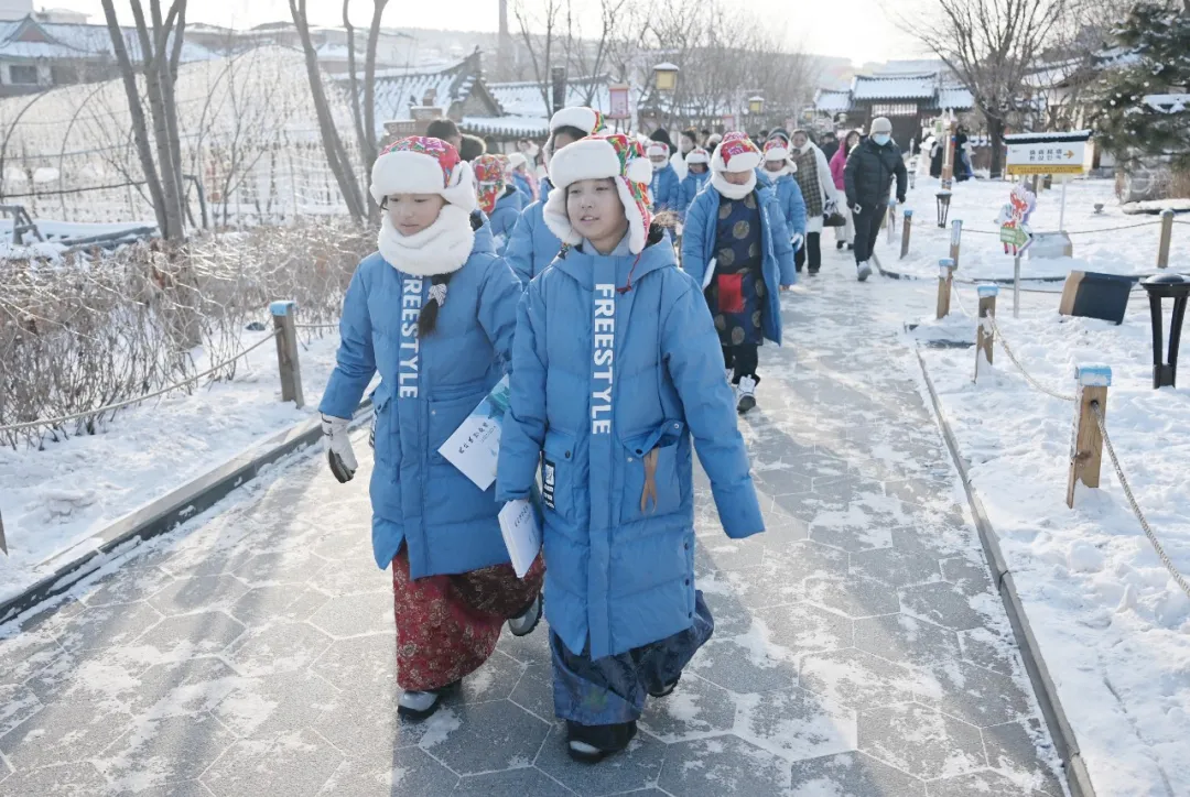 1月11日,中国朝鲜族民俗园银装素裹。园内,来自延吉市中央小学、北山小学的20名学生早早在此等候。车门开启,他们热情迎上,自然而然地接过新朋友的背包,“你们那里冬天也下雪吗?”“在延吉能玩几天?”……去往民俗园小剧场的路上,问题一个接一个,欢声笑语洒满一路。