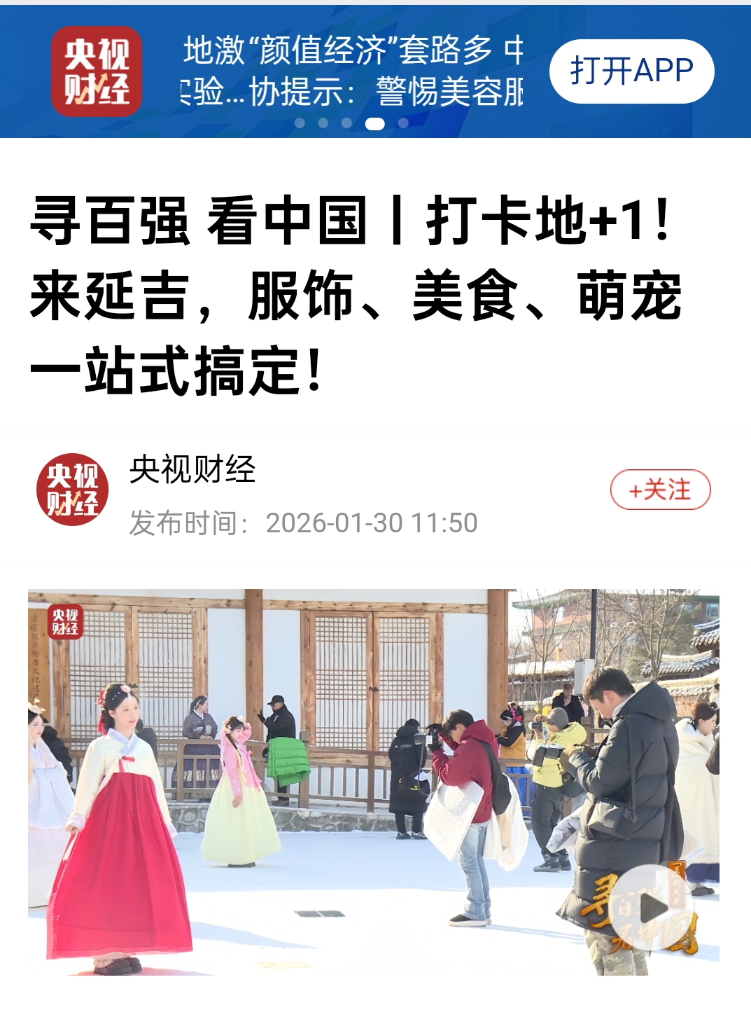 由延边广播电视台记者采写的新闻《寻百强看中国丨打卡地+1!来延吉,服饰、美食、萌宠一站式搞定!》1月30日分别被央视财经和央视频采用。