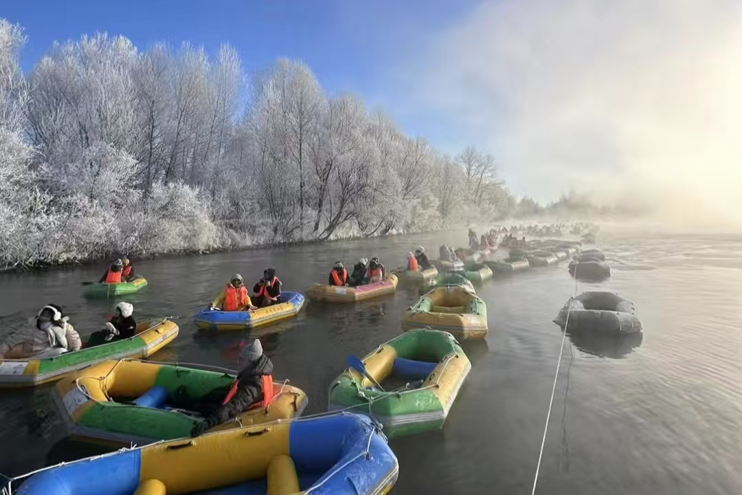 踏入这片冰雪秘境,脚下粉雪绵软,行走的“咯吱”声仿佛是通往童话世界的密语。源自长白山的溪流不甘冰封,在寒冬中锻造出晶莹的冰瀑,清泉于冰层之下潺潺不息,静中有动,赋予冬日灵动的诗意。晨起的雾凇长廊,是自然馈赠的琉璃世界,乘皮筏于雾凇下漂流,冰花轻溅,宛如穿行仙境。