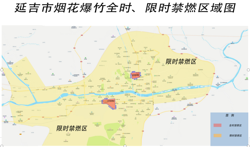 限时禁燃区域详见《延吉市烟花爆竹全时、限时禁燃区域图》黄色阴影区域。原则上禁止22点至次日凌晨6点燃放烟花爆竹(除夕、农历初一、十五禁限燃时间可放宽至0点30分至6点)。