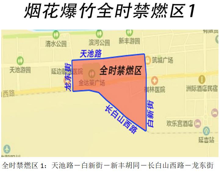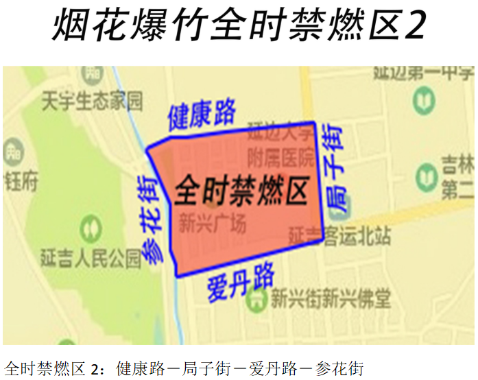 (二)全时禁燃放烟花爆竹场所。全时禁燃放区域涉及新兴街道、河南街道。详见《延吉市烟花爆竹全时、限时禁燃区域图》红色阴影区域。全时禁燃区: