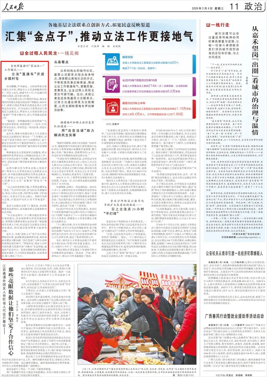 2月4日,人民日报11版“全过程人民民主·一线见闻”专栏刊发《吉林珲春推行“家站合一”工作模式——立法“直通车”开进乡镇村屯》。