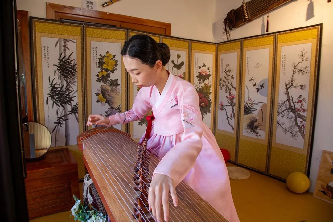 在一处庭院内,伽倻琴经典独奏婉转悠扬。演奏者指尖轻拨间流淌出非遗代表性音乐的独特韵味,游客们屏息驻足,沉浸式感受朝鲜族传统艺术魅力。