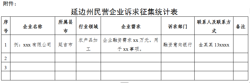 为贯彻州委、州政府关于促进民营经济发展壮大的决策部署,深入推进“445”产业发展工程,全面落实《延边州民营企业诉求办理工作机制》,进一步优化我州营商环境,精准服务民营企业,切实解决企业发展中遇到的困难和问题,州工商联、州财政局、州税务局、人民银行延边州分行现联合向全州民营企业公开征集发展诉求。有关事项公告如下: