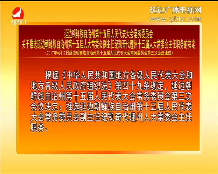 延边朝鲜族自治州第十五届人民代表大会常务委员会关于推选延边朝鲜族自治州第十五届人大常委会副主任纪凯奇代理州十五届人大常委会主任职务的决定