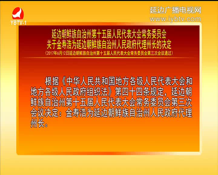延边朝鲜族自治州第十五届人民代表大会常务委员会关于金寿浩为延边朝鲜族自治州人民政府代理州长的决定