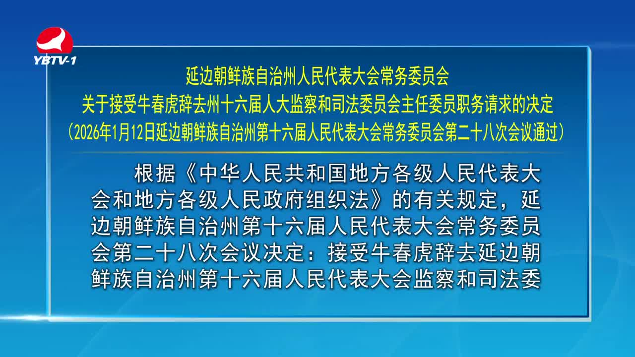 延边朝鲜族自治州人民代表大会常务委员会关于接受牛春虎辞去州十六届人大监察和司法委员会主任委员职务请求的决定