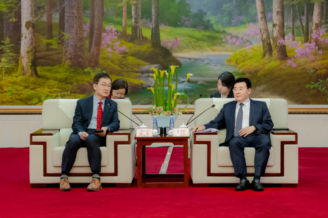 5月15日,省委常委、州委书记胡家福在延吉会见了韩国江原特别自治道副知事郑光烈一行。