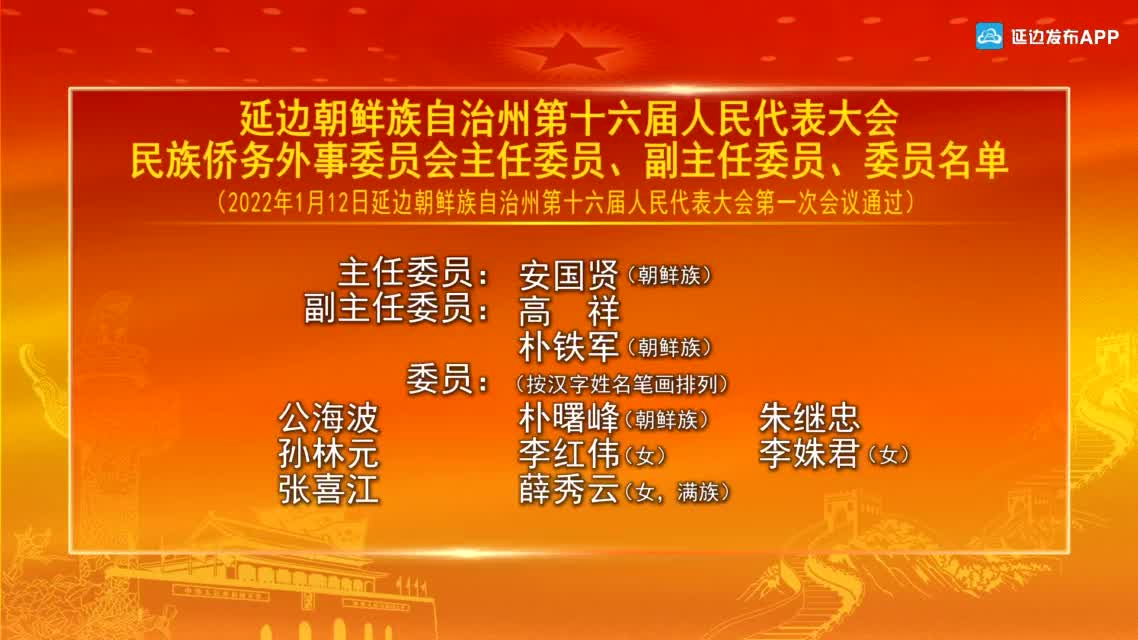 【视频新闻】延边朝鲜族自治州第十六届人民代表大会民族侨务外事委员会主任委员、副主任委员、委员名单