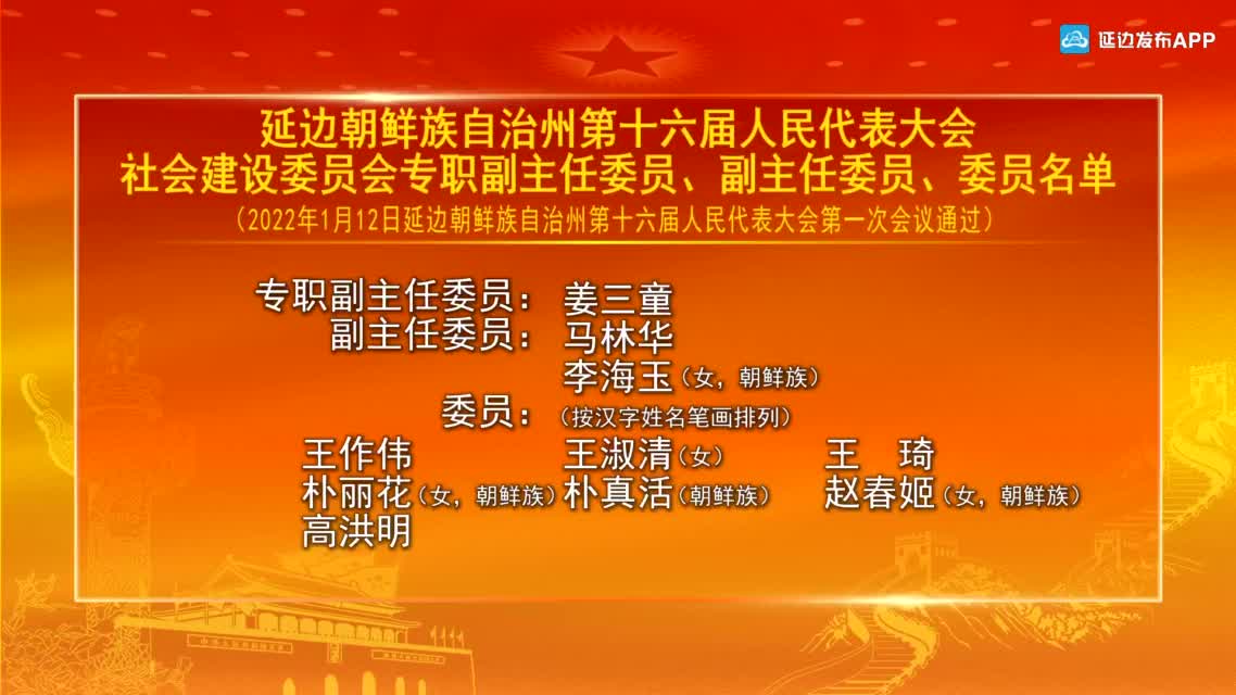 【视频新闻】延边朝鲜族自治州第十六届人民代表大会社会建设委员会专职副主任委员、副主任委员、委员名单