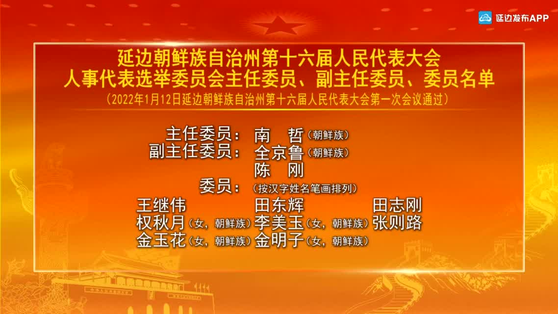 【视频新闻】延边朝鲜族自治州第十六届人民代表大会人事代表选举委员会主任委员、副主任委员、委员名单