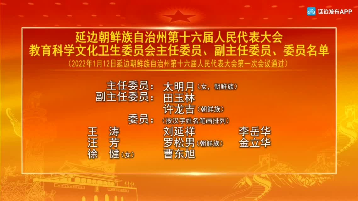 【视频新闻】延边朝鲜族自治州第十六届人民代表大会教育科学文化卫生委员会主任委员、副主任委员、委员名单