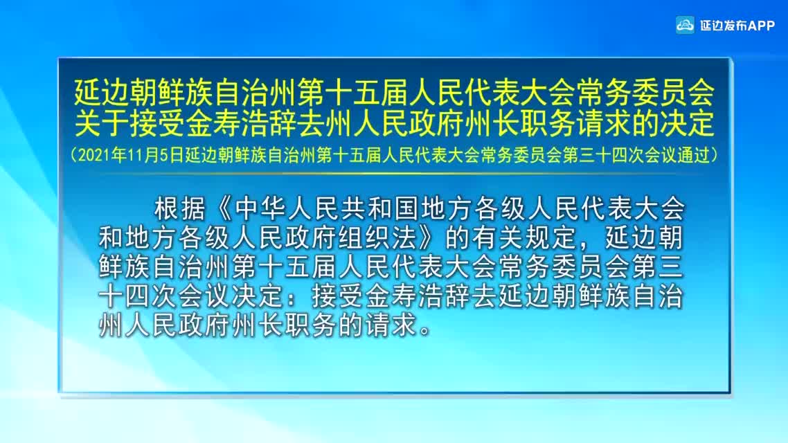 【视频新闻】延边朝鲜族自治州第十五届人民代表大会常务委员会关于接受金寿浩辞去州人民政府州长职务请求的决定