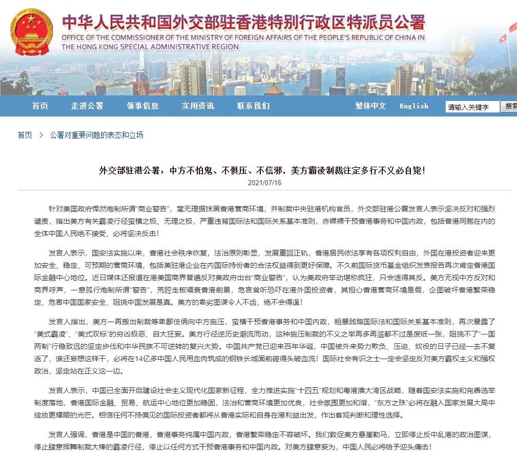 美方无视中方反对和商界呼声,一意孤行炮制所谓“警告”,荒腔走板唱衰香港前景,危言耸听恐吓在港外国投资者,其担心香港营商环境是假,企图破坏香港繁荣稳定、危害中国国家安全、阻挠中国发展是真