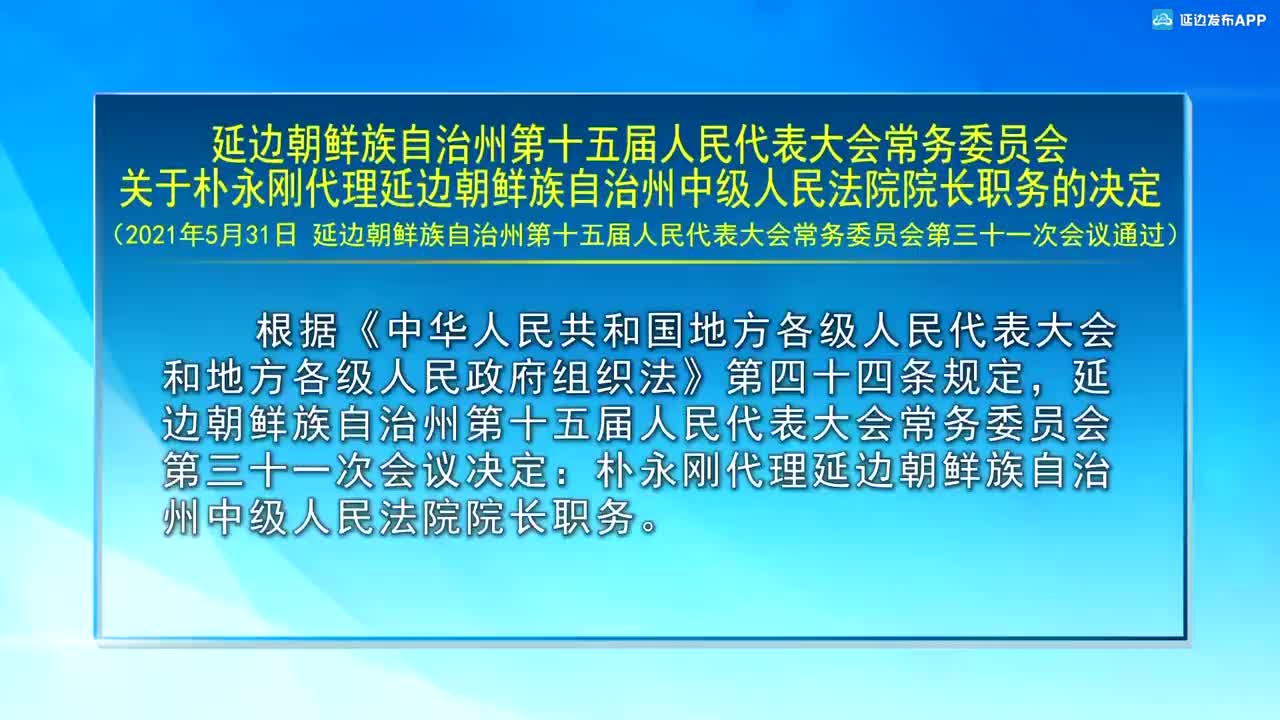 【视频新闻】延边朝鲜族自治州第十五届人民代表大会常务委员会关于朴永刚代理延边朝鲜族自治州中级人民法院院长职务的决定
