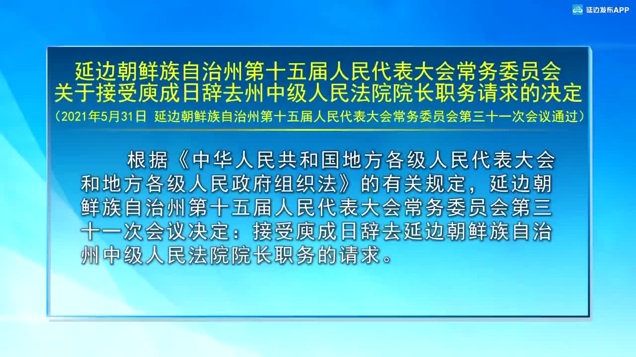 【视频新闻】延边朝鲜族自治州第十五届人民代表大会常务委员会关于接受庾成日辞去州中级人民法院院长职务请求的决定