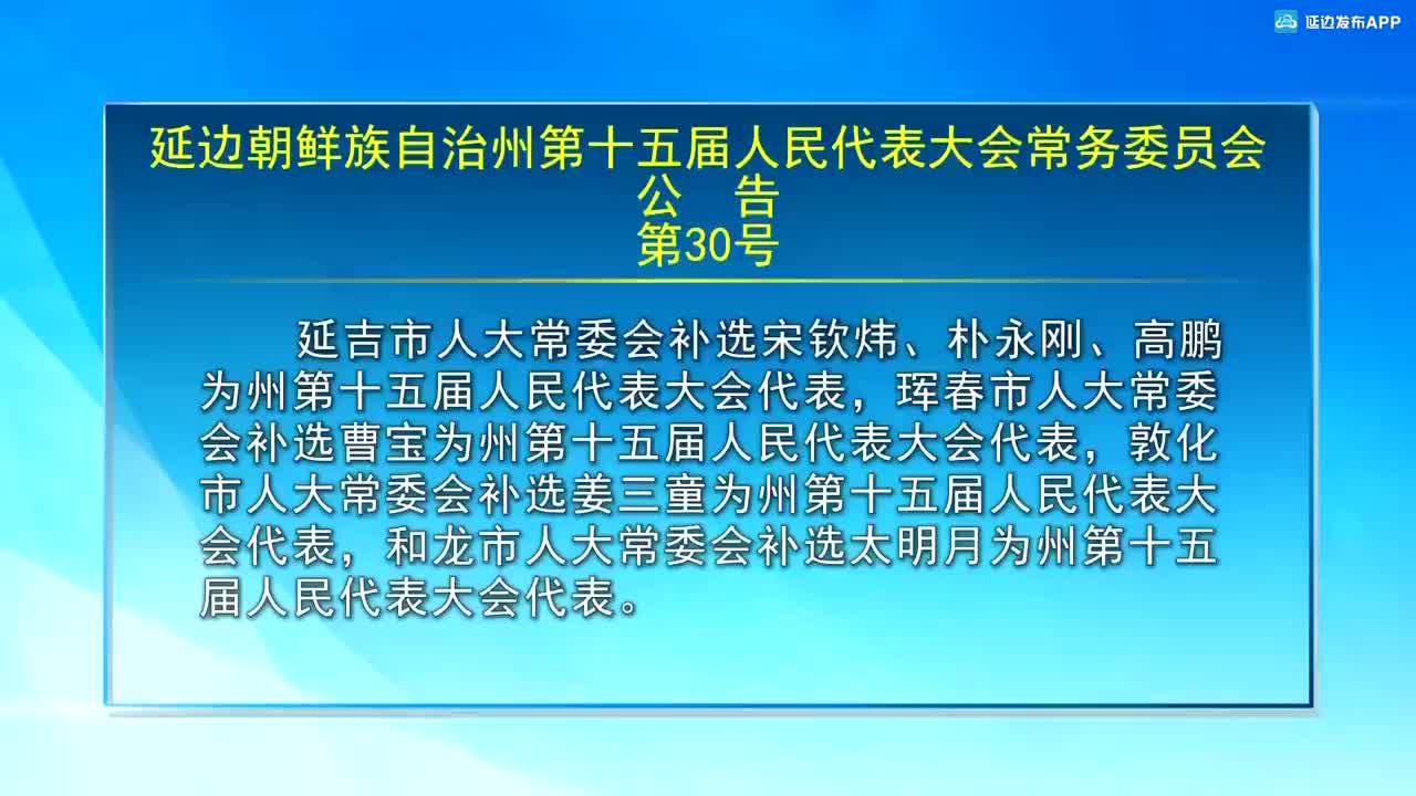 【视频新闻】延边朝鲜族自治州第十五届人民代表大会常务委员会公告第30号