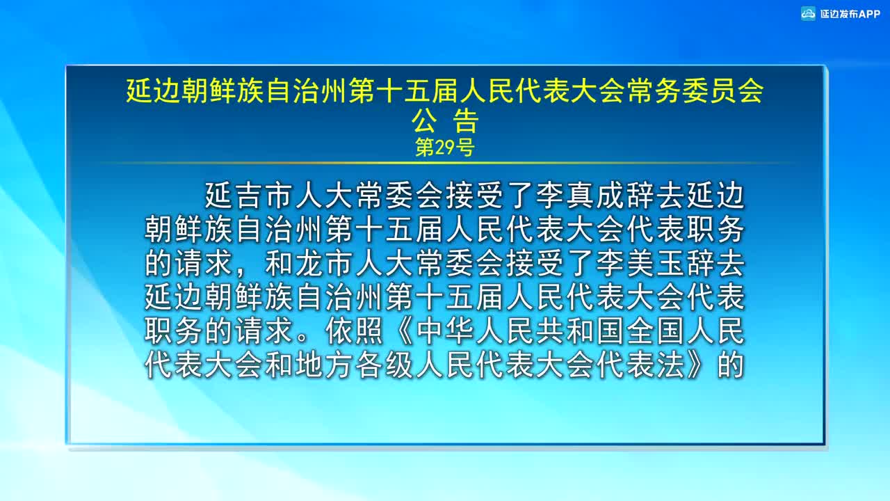 【视频新闻】延边朝鲜族自治州第十五届人民代表大会常务委员会公告第29号