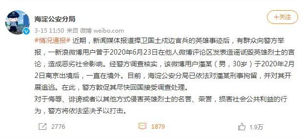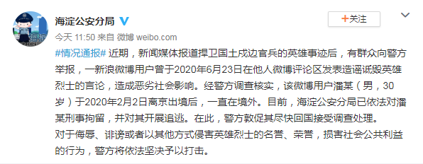 网民潘某在境外诋毁戍边战士,刑拘、追逃!