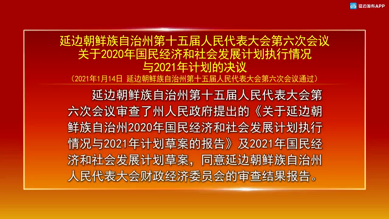 【视频新闻】延边朝鲜族自治州第十五届人民代表大会第六次会议关于2020年国民经济和社会发展计划执行情况与2021年计划的决议