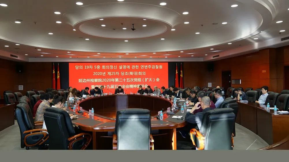 延边州检察院召开党组扩大会议,州院党组书记、检察长金杰宣讲党的十九届五中全会精神,院党组成员出席会议,各部门负责人列席会议。