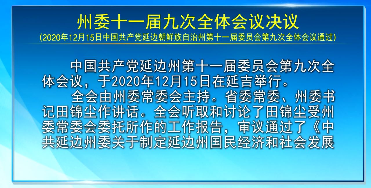 全会坚持以习近平新时代中国特色社会主义思想为指导,深入落实党的十九届五中全会和省委十一届八次全会精神,听取和讨论了田锦尘受州委常委会委托所作的工作报告,审议通过了《中共延边州委关于制定延边州国民经济和社会发展第十四个五年规划和二○三五年远景目标的建议》