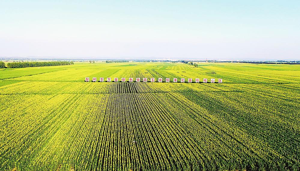 ↑吉林省梨树县国家百万亩绿色食品原料(玉米)标准化生产基地核心示范区(7月23日摄)
