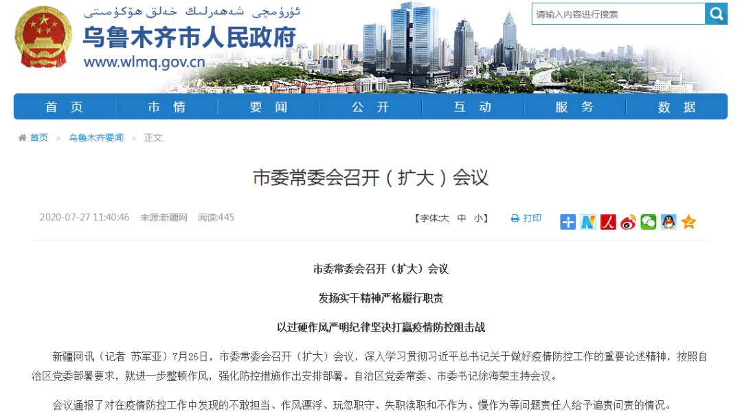 乌鲁木齐:已对疫情防控中不敢担当等问题责任人追责问责