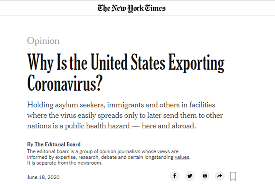 ▲截图来自《纽约时报》的社评文章《纽约时报》首先在其社评中指出,在今年3月21日,特朗普当局宣布为了保护美国不受境外疫情的涌入,将无限期延长限制外国人入境美国的措施,同时那些非法入境美国的难民也将被直接遣返