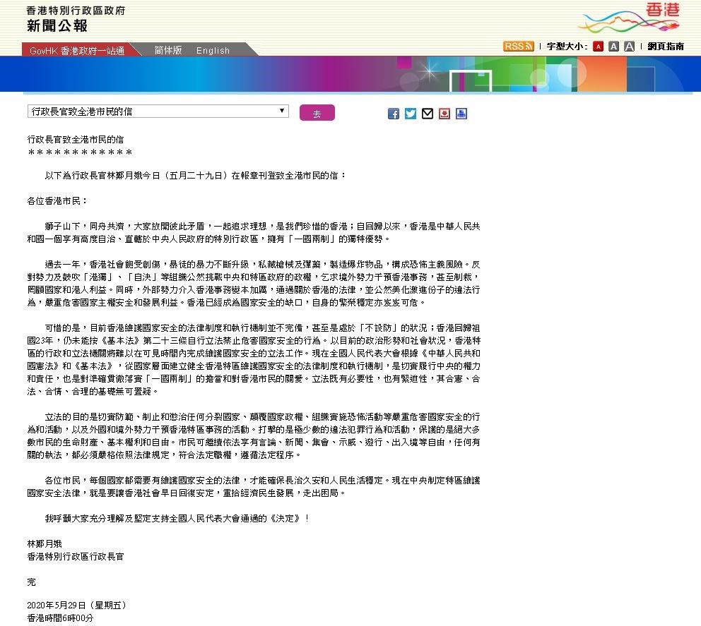 林郑月娥致全港市民的信:呼吁大家充分理解及坚定支持全国人民代表大会通过的《决定》